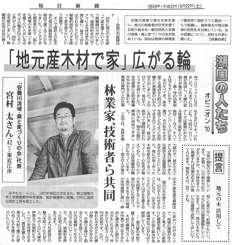 毎日新聞”湖国の人たち”で、安曇川流域・森と家づくりの会の取り組みを紹介いただきました。